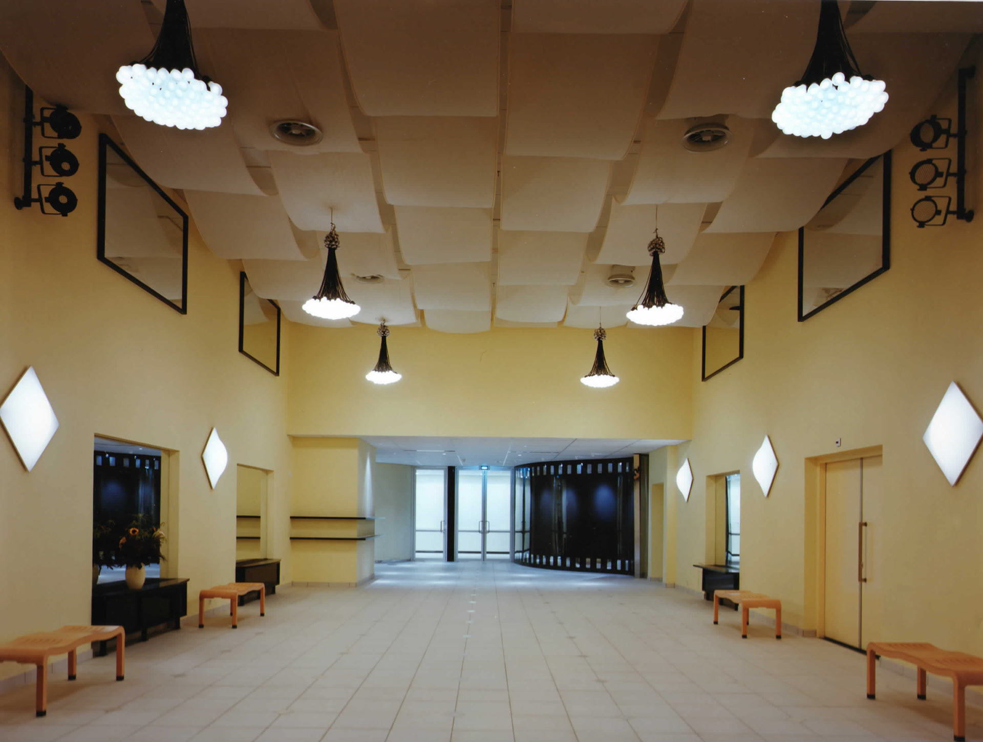 Theater & Bioscoop De Gemeente Emmeloord benaderde ons, het bestaande beursgebouw kreeg een nieuwe bestemming, Een culturele bestemming welteverstaan, gezien de positieve ervaring bij de Oosterpoort en de Stadsschouwburg te Groningen, werden wij als architect geselecteerd. De kleedkamers en het laden en lossen, hebben we in een aparte laagbouw, achter het bestaande gebouw ontworpen. Ter plaatse van het toneel, hebben we de toneeltoren verhoogd, zodat er ruimte werd geboden om de toneeldoeken te ‘’changeren’ met behulp van ’trekken’ aan een ’trekkenwand’. Tevens zijtonelen toegevoegd, en een oplopende theaterzaal met balkon. De theaterzaal hebben we een warme uitstraling gegeven, en zijn de klankkaatsers aan het plafond zichtbaar, de bioscoopzaal heeft een wat technischere uitstraling als contrast. @ Architectengroep Duintjer Opdrachtgever: Gemeente Emmeloord Oplevering: 1996 Programma: Theaterzaal á 420 plaatsen Bioscoopzaal á 100 plaatsen Multifunctionele zaal