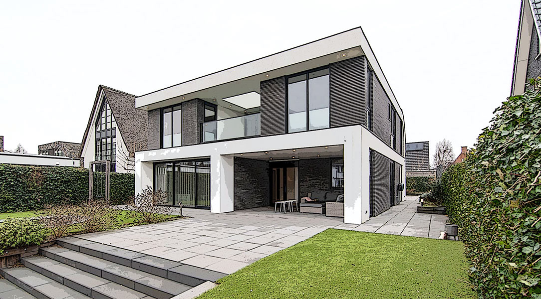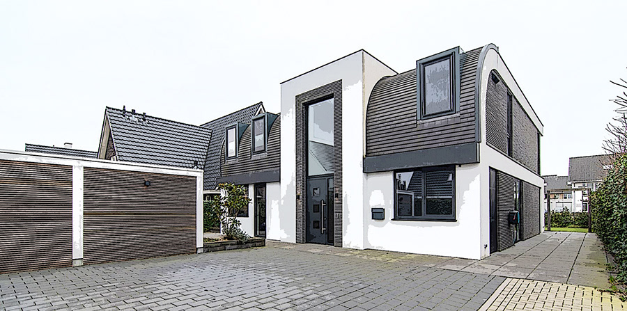 Ultra moderne wit gestucte villa, met gebogen dakvorm en eigenwijs doorgestoken dakkapellen